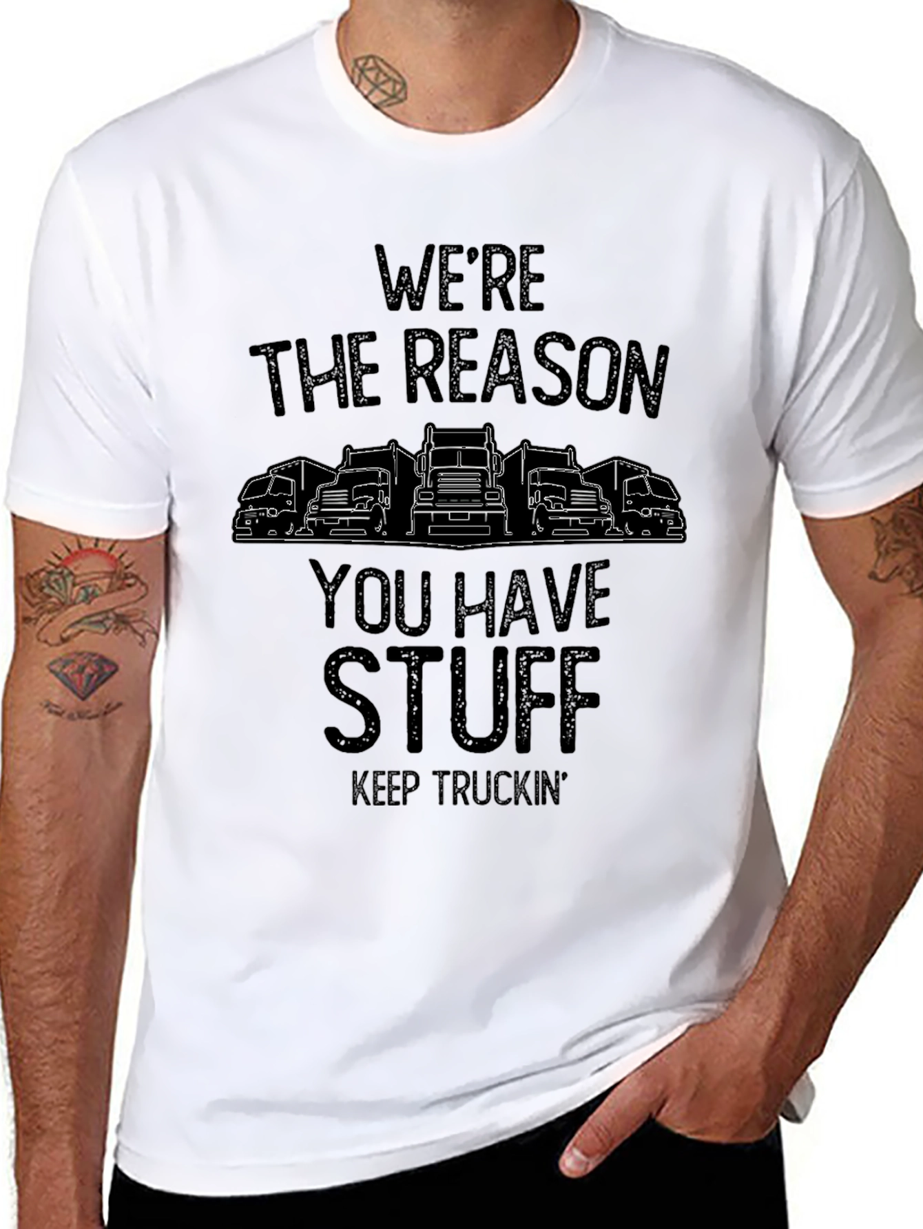 This black t-shirt proudly displays the message: "We're the reason you have stuff. Keep Truckin'." The shirt features a line drawing of semi-trucks, emphasizing the importance of the trucking industry. Made from comfortable fabric, this tee is perfect for truckers, their families, or anyone who appreciates the hard work that goes into delivering goods. Wear it to work, casual outings, or truck shows. Show your support for the trucking community with this unique and stylish t-shirt.