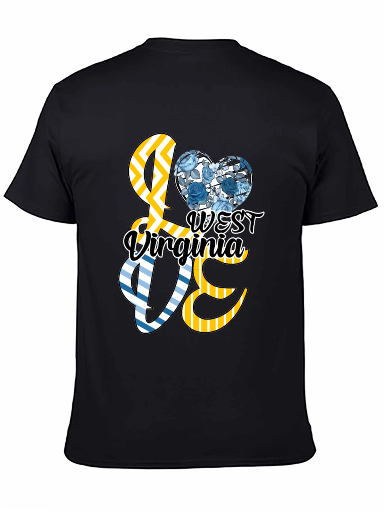 Show your love for West Virginia with this stylish graphic tee. The design features the word "Love" incorporating the state's name, with a floral heart detail. The "L" is accented in WVU gold and the "ve" is in blue and gold stripes. Made from a comfortable material, this tee is perfect for casual wear, sporting events, or showing state pride. Get yours today!