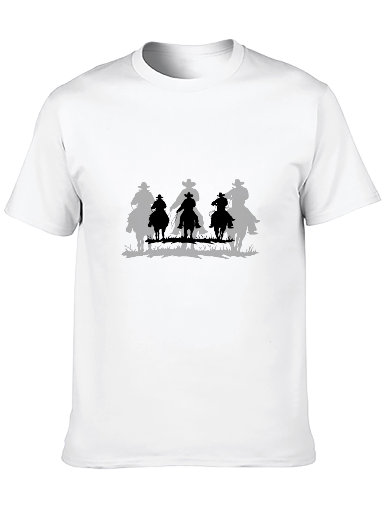 Embrace the spirit of the Old West with this striking black t-shirt. The design features a detailed silhouette of cowboys on horseback, riding off into the distance. The minimalist design provides a classic look that is suitable for everyday use. Made from a soft, breathable fabric, this tee offers all-day comfort and durability. The short sleeves and crew neck provide a relaxed fit, perfect for casual wear. Ideal for those who love Westerns or want to add a touch of rugged style to their wardrobe. A must-have for any fan of classic Western movies, or anyone who loves the western aesthetic!