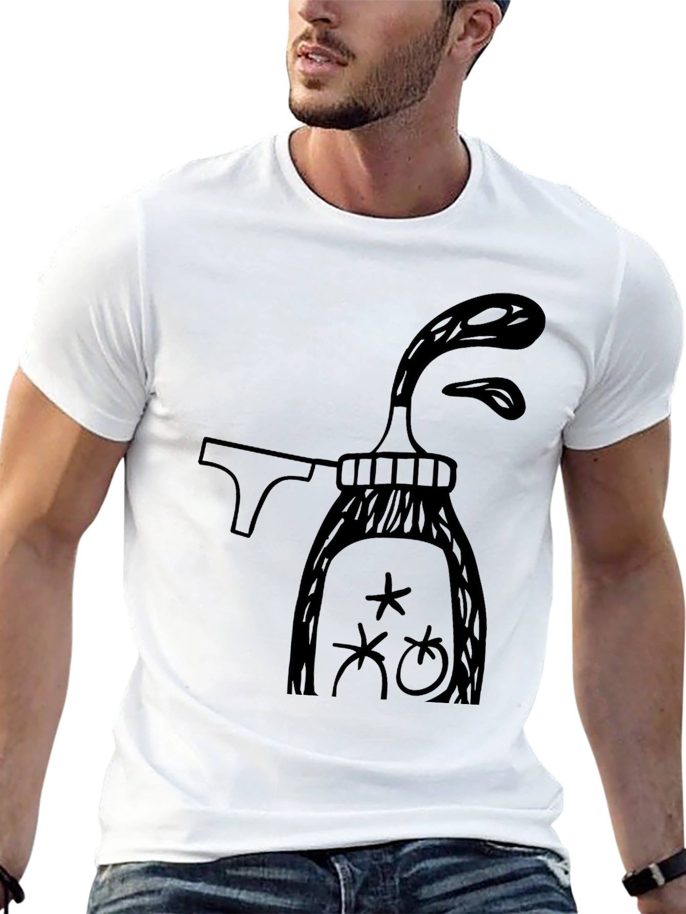 Elevate your casual style with this eye-catching black graphic tee. Made from comfortable, breathable cotton, this t-shirt features a unique and whimsical design of a bottle with quirky facial elements. The black backdrop makes the design pop, ensuring you stand out from the crowd. Ideal for everyday wear, casual outings, or as a fun conversation starter, this t-shirt combines comfort with artistic flair. Its classic fit is flattering for all body types, while the durable material ensures long-lasting wear. Add a touch of playful creativity to your wardrobe with this distinctive piece.