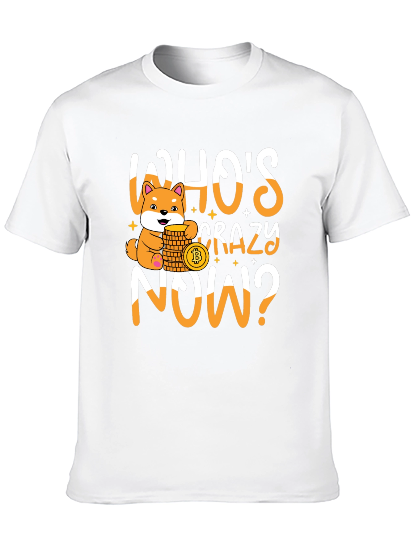 Show your love for cryptocurrency with this fun and stylish t-shirt! Featuring a cute Shiba Inu dog holding a stack of Bitcoin coins, this black t-shirt is sure to turn heads. The playful "Who's Crazy Now?" graphic adds a touch of humor. Made from comfortable, breathable fabric, it's perfect for everyday wear. Great for crypto enthusiasts, dog lovers, or anyone who appreciates unique designs. Stand out from the crowd and express your passion with this eye-catching tee. This shirt is a conversation starter!