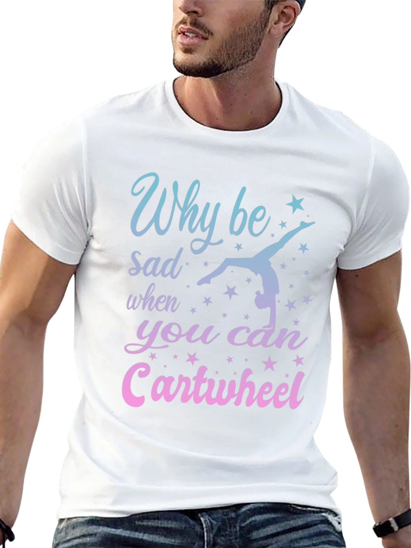 Show off your love of gymnastics with this fun graphic tee! The black t-shirt features a gymnast performing a cartwheel alongside the phrase "Why be sad when you can cartwheel?" in an ombre color scheme. The tee is ideal for gymnasts and gymnastics enthusiasts alike. It is made of soft and breathable fabric, ensuring all-day comfort. Perfect for wearing to practice, competitions, or just to show off your passion for gymnastics. This stylish tee makes a statement and is sure to be a favorite in your wardrobe!