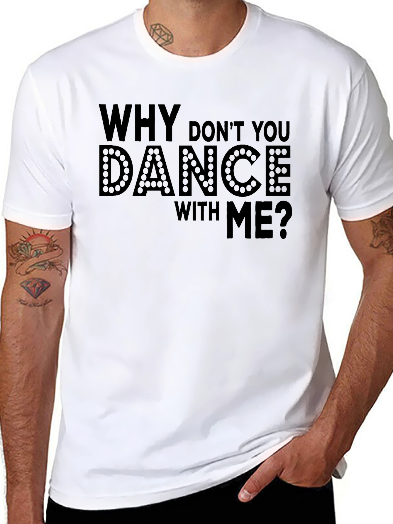 Make a statement with this striking black t-shirt. The design features the phrase "Why Don't You Dance With Me?" in a bold, eye-catching font. The word "DANCE" is uniquely styled with a dotted, marquee-light effect, adding a touch of vintage charm. The shirt appears to be made of a soft, comfortable material, perfect for casual wear or a night out. This tee is ideal for expressing your playful side and inviting a little fun into your wardrobe. Wear it to a party, a concert, or just out and about to spark conversation and maybe even get someone to dance! It's a fun and fashionable choice for anyone.