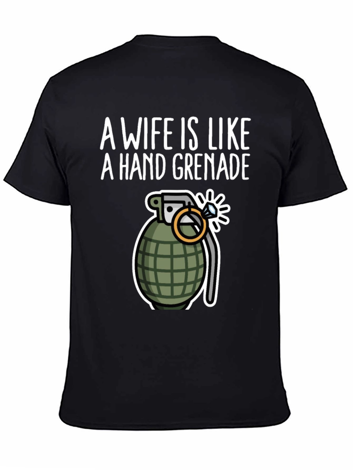This humorous black t-shirt features a bold statement: "A Wife is Like a Hand Grenade". Below the text is a cartoon-style illustration of a hand grenade with a ring attached. This tee is perfect for those with a playful sense of humor about marriage. The design is printed on what appears to be a soft, comfortable cotton blend fabric. Ideal for casual wear, parties, or as a gag gift for a groom-to-be or a seasoned husband.
