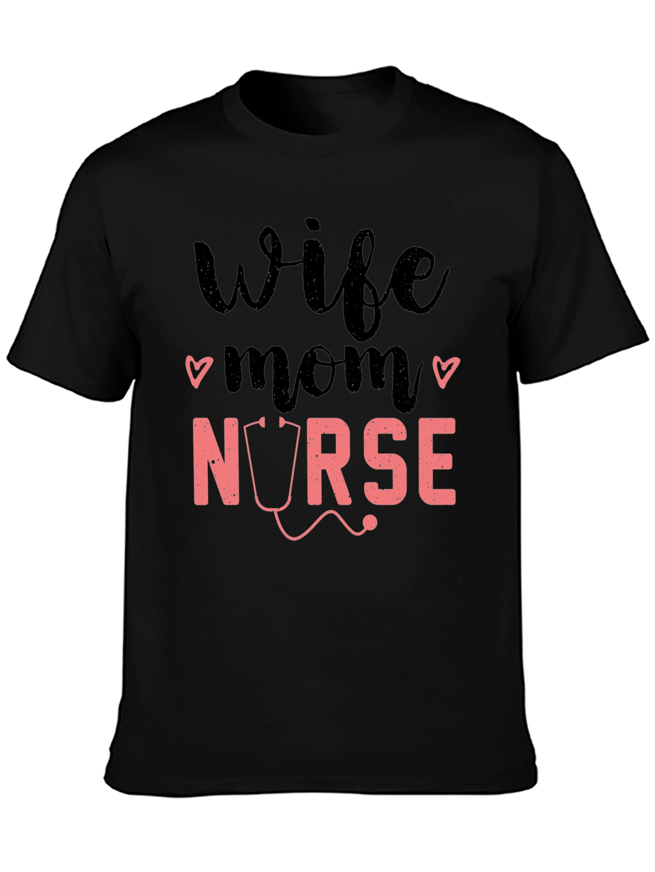 Show your pride as a wife, mom, and nurse with this stylish black t-shirt. The tee features a bold, eye-catching design with the words "Wife," "Mom," and "Nurse" prominently displayed in a combination of black and pink fonts. The word "Nurse" is creatively accented with a stethoscope graphic. Made from comfortable materials, this t-shirt is perfect for everyday wear, casual outings, or as a thoughtful gift for the amazing women in your life who balance multiple roles with grace. This tee is a stylish way to express your dedication and love for family and career.