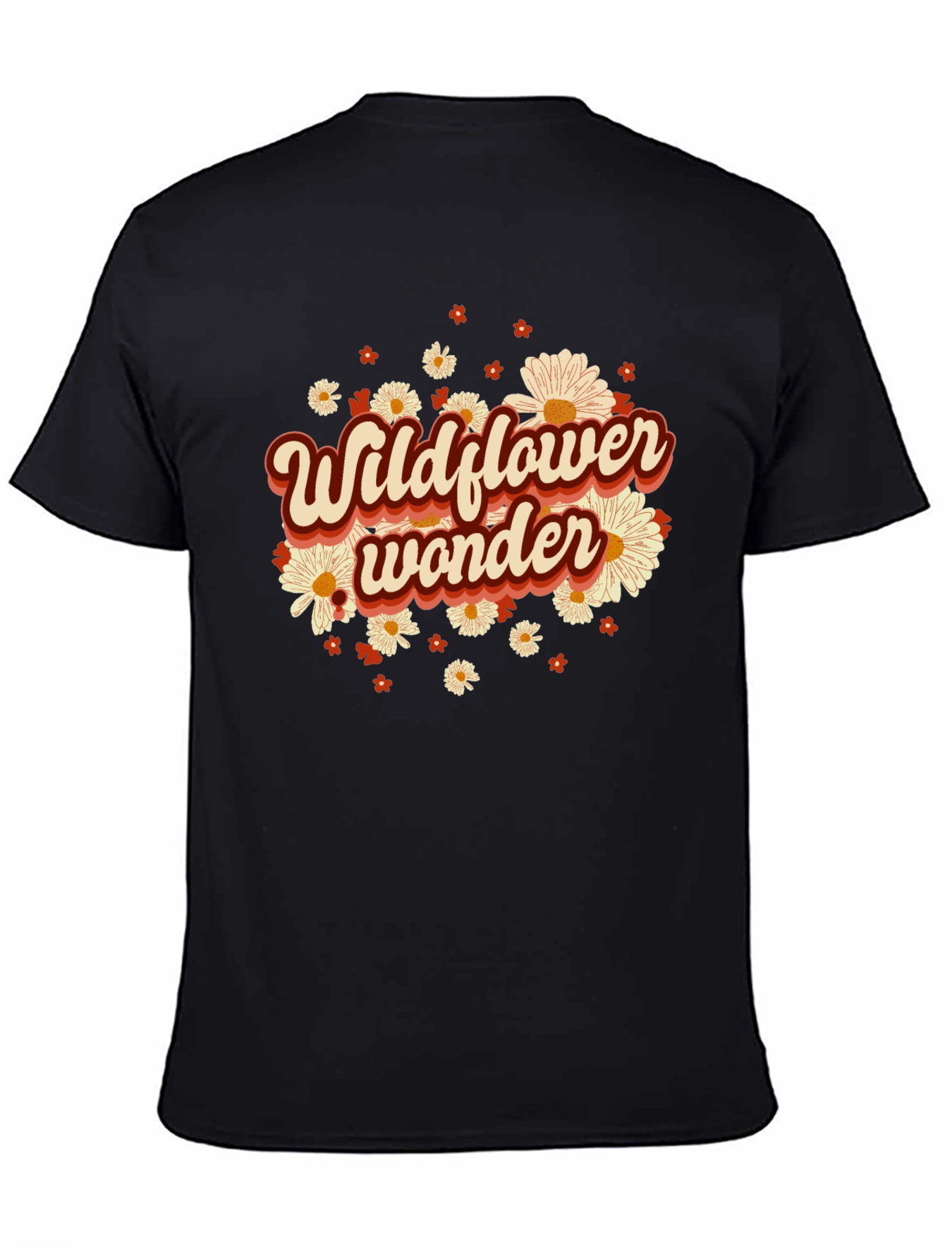 Embrace the beauty of nature with this eye-catching graphic tee. Featuring a retro-inspired design, this shirt showcases the words 'Wildflower Wonder' in a stylish, layered font, surrounded by a delightful array of daisies and small orange flowers. The design exudes a vintage charm. The shirt itself appears to be made of a soft, breathable black fabric, perfect for casual wear. Its comfortable fit makes it ideal for everyday activities, outdoor adventures, or simply lounging in style. Add a touch of floral fun to your wardrobe with this unique and expressive t-shirt.