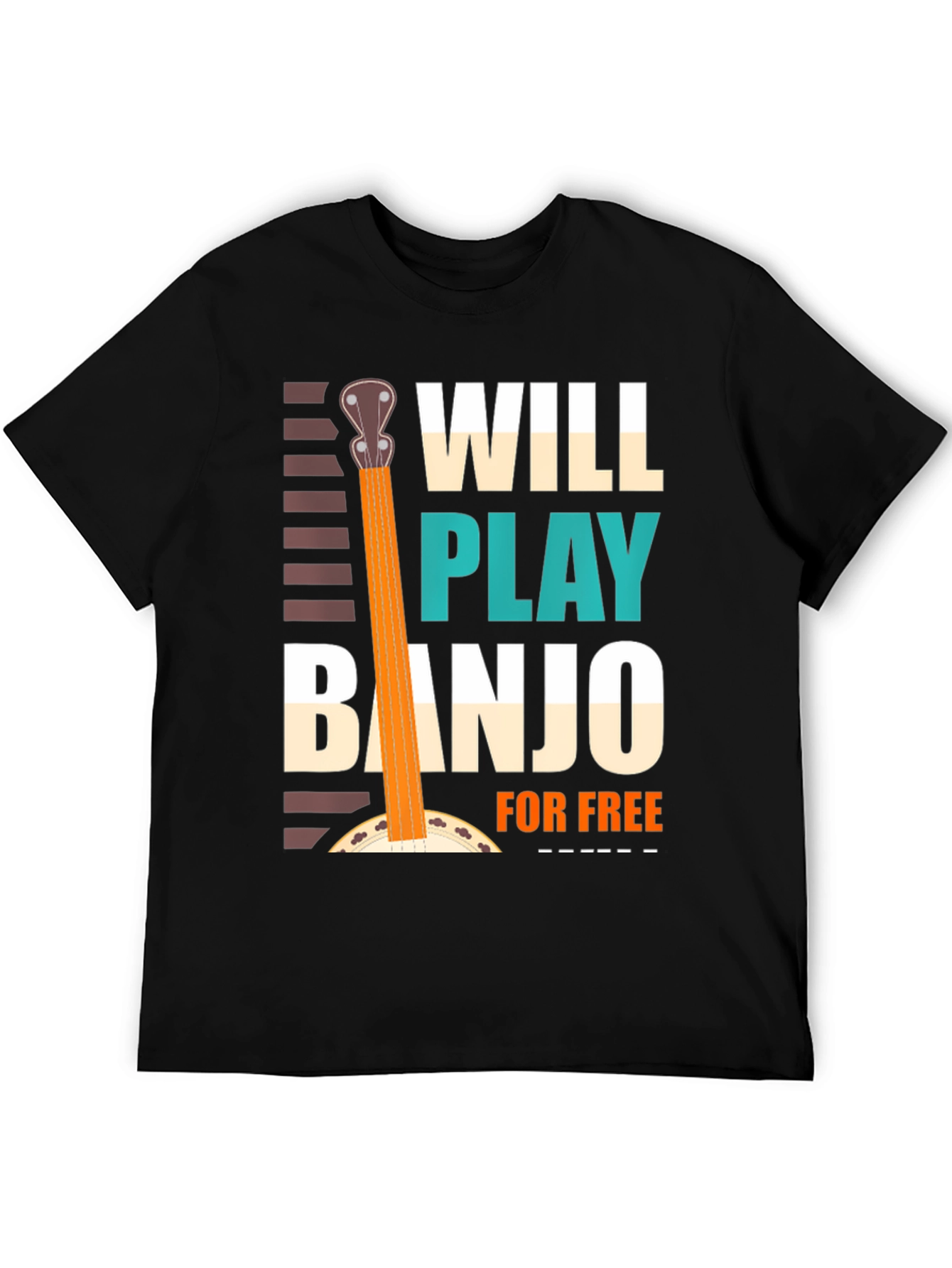 Showcase your passion for music with this eye-catching t-shirt. Made from comfortable black fabric, this tee features a vibrant graphic design. The text "WILL PLAY BANJO FOR FREE" is prominently displayed, with a banjo illustration completing the design. Ideal for musicians, banjo enthusiasts, or anyone who appreciates a fun and unique shirt, this tee is perfect for casual outings, concerts, or music festivals. The playful design is sure to spark conversations and showcase your love for the banjo. Get yours today and let the world know you're ready to play!
