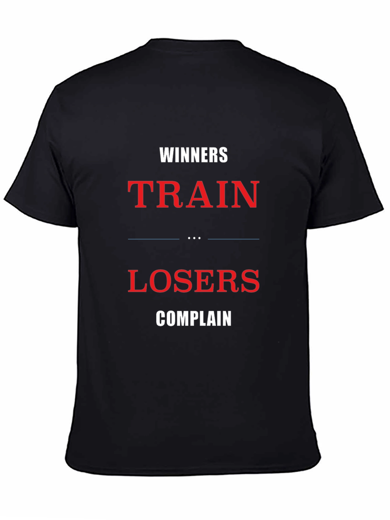 Elevate your mindset and style with this bold "Winners Train, Losers Complain" graphic tee. Crafted from comfortable, breathable fabric, this shirt features a striking design with the words in contrasting fonts to make a statement. Perfect for workouts, casual outings, or everyday wear, this t-shirt serves as a daily reminder to stay focused and driven. The classic fit ensures all-day comfort, while the eye-catching design sparks conversations and motivates those around you. Wear your ambition and inspire greatness with this must-have addition to your wardrobe.