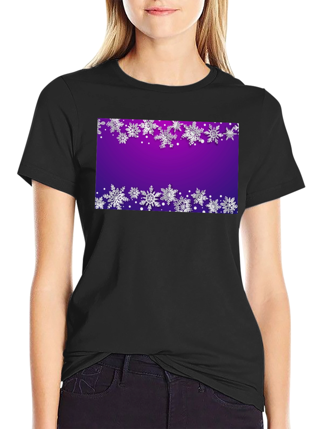 Embrace the winter spirit with this eye-catching graphic tee. This stylish black t-shirt features a vibrant design of shimmering snowflakes against a gradient purple backdrop. The detailed snowflake print creates a festive and unique look. Made from a comfortable material, this tee is perfect for casual wear during the holiday season or any time you want to add a touch of winter charm to your outfit. Pair it with jeans or leggings for a relaxed, stylish look. The shirt's design is ideal for winter celebrations and cozy days inside. Stand out with this festive tee!