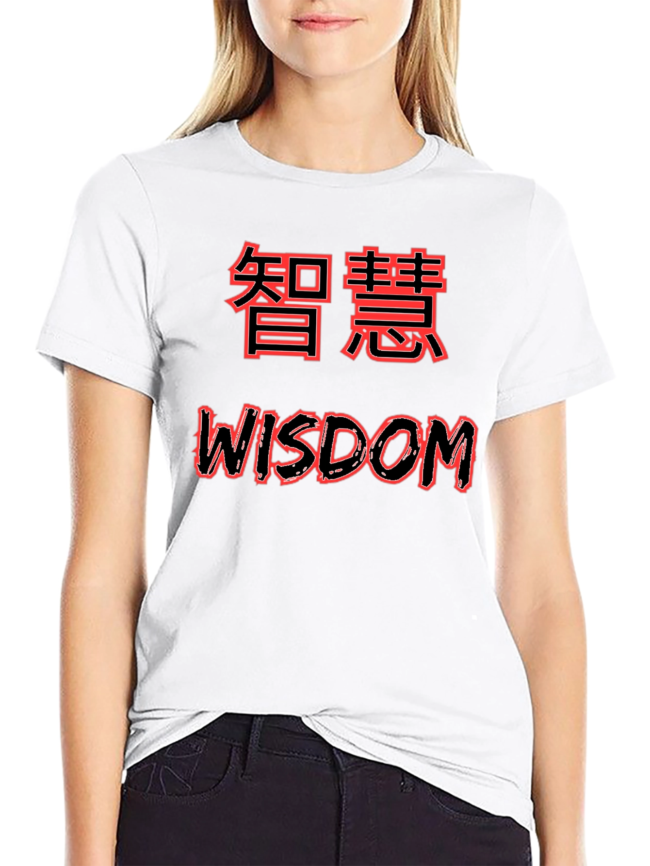 This striking black t-shirt features a bold design with the word "WISDOM" in vibrant red lettering, accompanied by Asian characters of the same color, also meaning "wisdom". The graphic design gives a modern yet classic look. Crafted from a comfortable fabric, likely cotton or a blend, this tee is ideal for casual wear, expressing your individuality, or as a thoughtful gift for someone who values knowledge and understanding. Wear it to school, outings, or simply while relaxing at home to make a statement about your perspective.