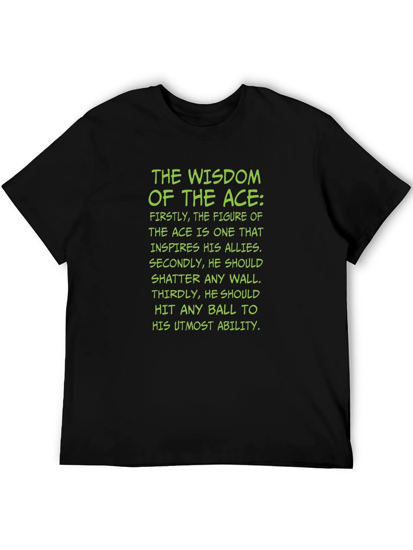 Embrace the philosophy of success with this striking black graphic tee. The shirt features a bold, green text design, declaring 'The Wisdom of the Ace' followed by insightful rules. The text describes the figure of the ace as inspirational, someone who breaks down walls and always performs to the best of their abilities. Made from a comfortable-looking fabric, this tee is perfect for casual wear, workouts, or making a statement. Show off your inner ace with this unique and motivational t-shirt.