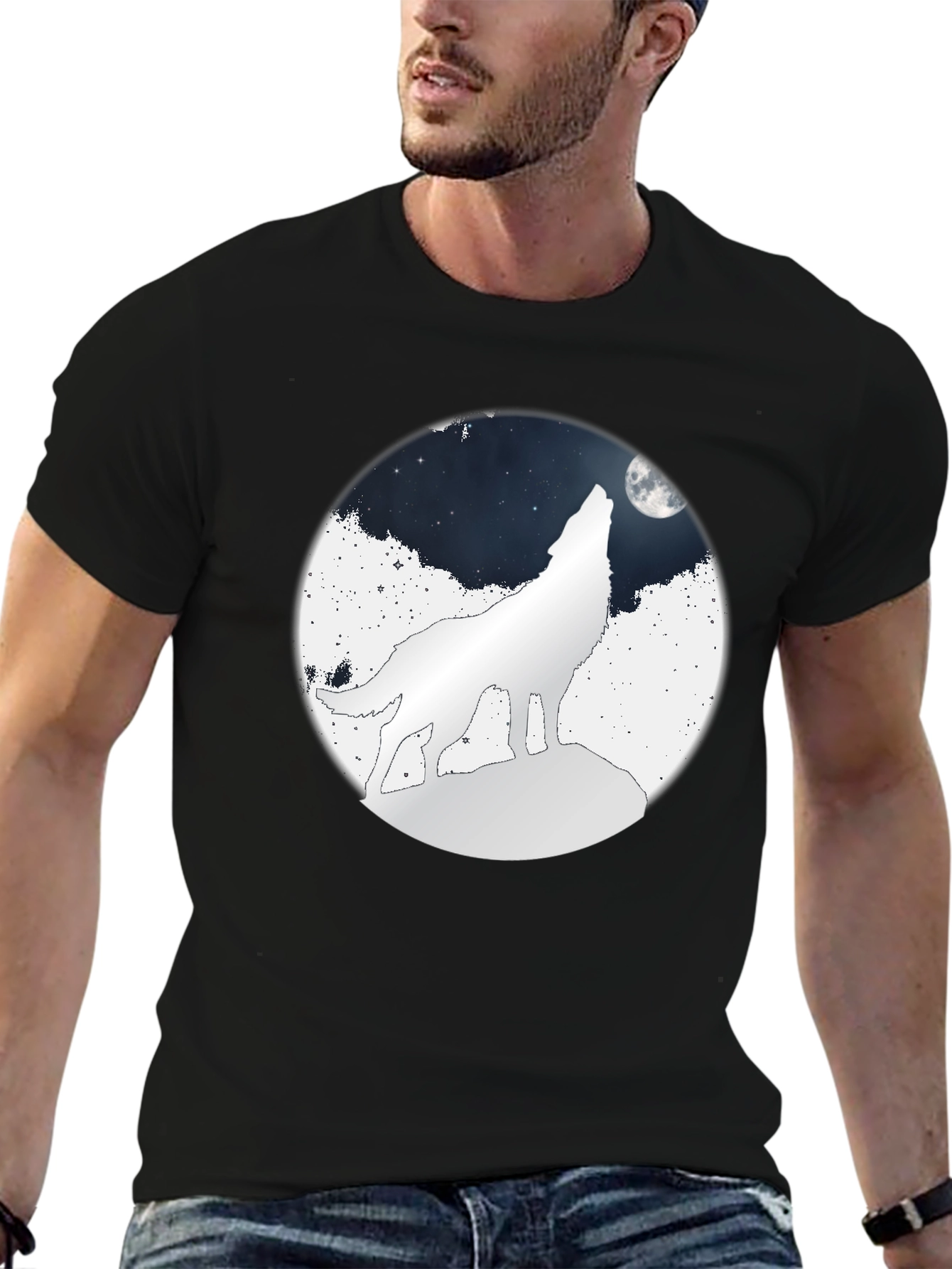 Embrace the night with this striking black cotton t-shirt featuring a unique wolf howling at the moon design. The graphic showcases a silhouette of a wolf against a backdrop of a starry night sky and a bright full moon, creating a captivating visual appeal. Made from comfortable and breathable cotton, this tee is perfect for everyday wear or as a statement piece for casual outings. Ideal for those who appreciate wildlife, nature, or distinctive graphic designs. Add a touch of wilderness to your wardrobe with this eye-catching t-shirt.