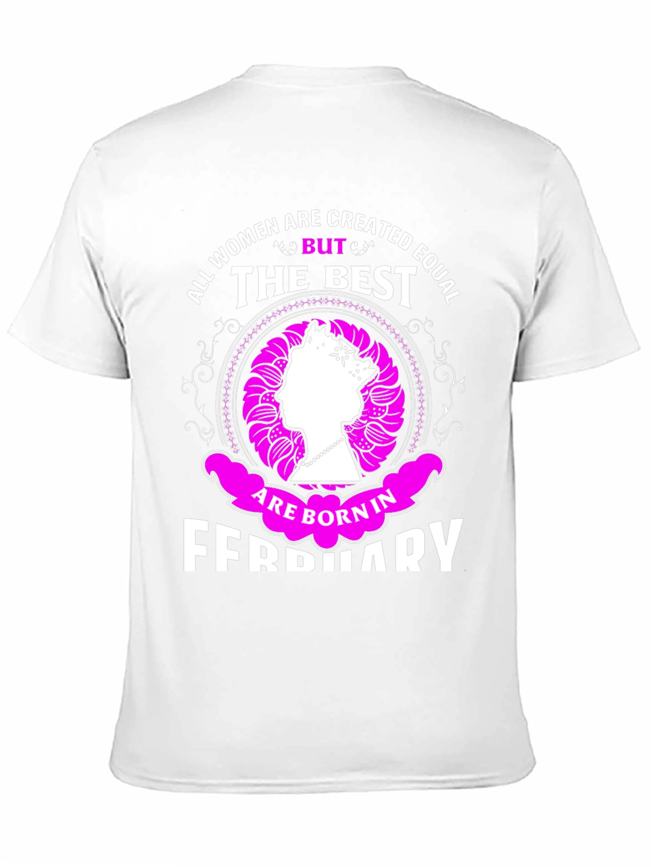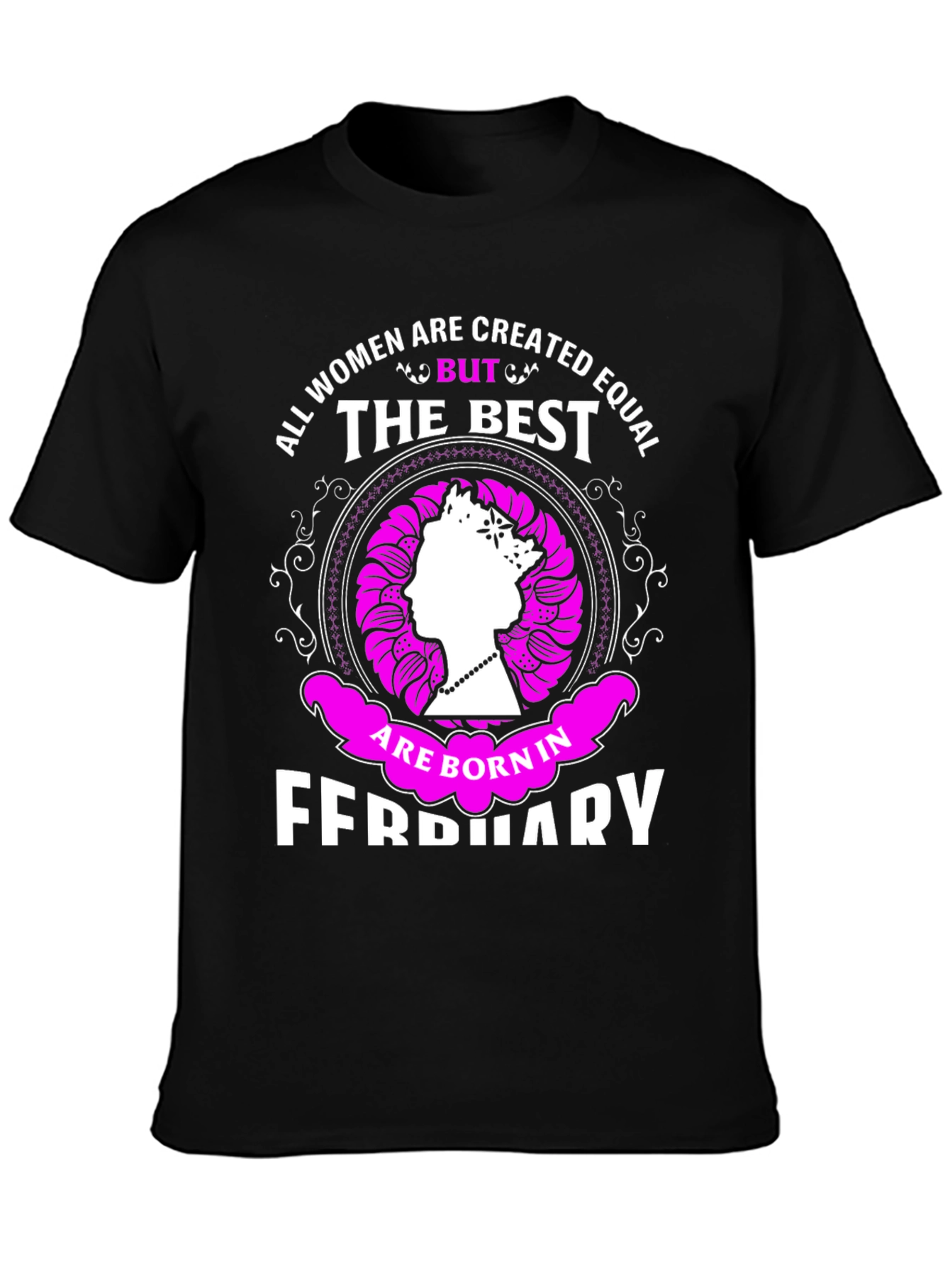Show off your birth month with this stylish black t-shirt! This eye-catching tee features a unique design stating "All women are created equal but the best are born in February." The design incorporates a regal silhouette of a queen, decorated with floral accents and vibrant pink highlights. The comfortable, lightweight fabric makes it perfect for everyday wear. This shirt is an excellent gift for any special woman born in February, celebrating their birthday in style. Wear it casually with jeans or dress it up with a skirt for a fashionable look.