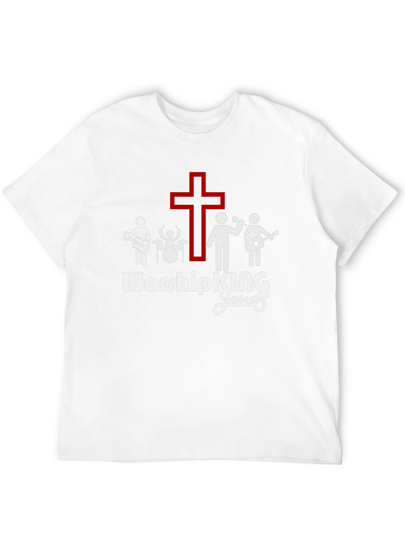 Express your faith and musical passion with this black t-shirt featuring a vibrant graphic. The design showcases a Christian band illustration with musicians, a cross, and the text 'Worship King Jesus'. Made from comfortable fabric, this shirt is perfect for church gatherings, concerts, or everyday wear. Let your faith shine with this meaningful and stylish t-shirt. Great way to spark conversations and share your love for Christian music and devotion.