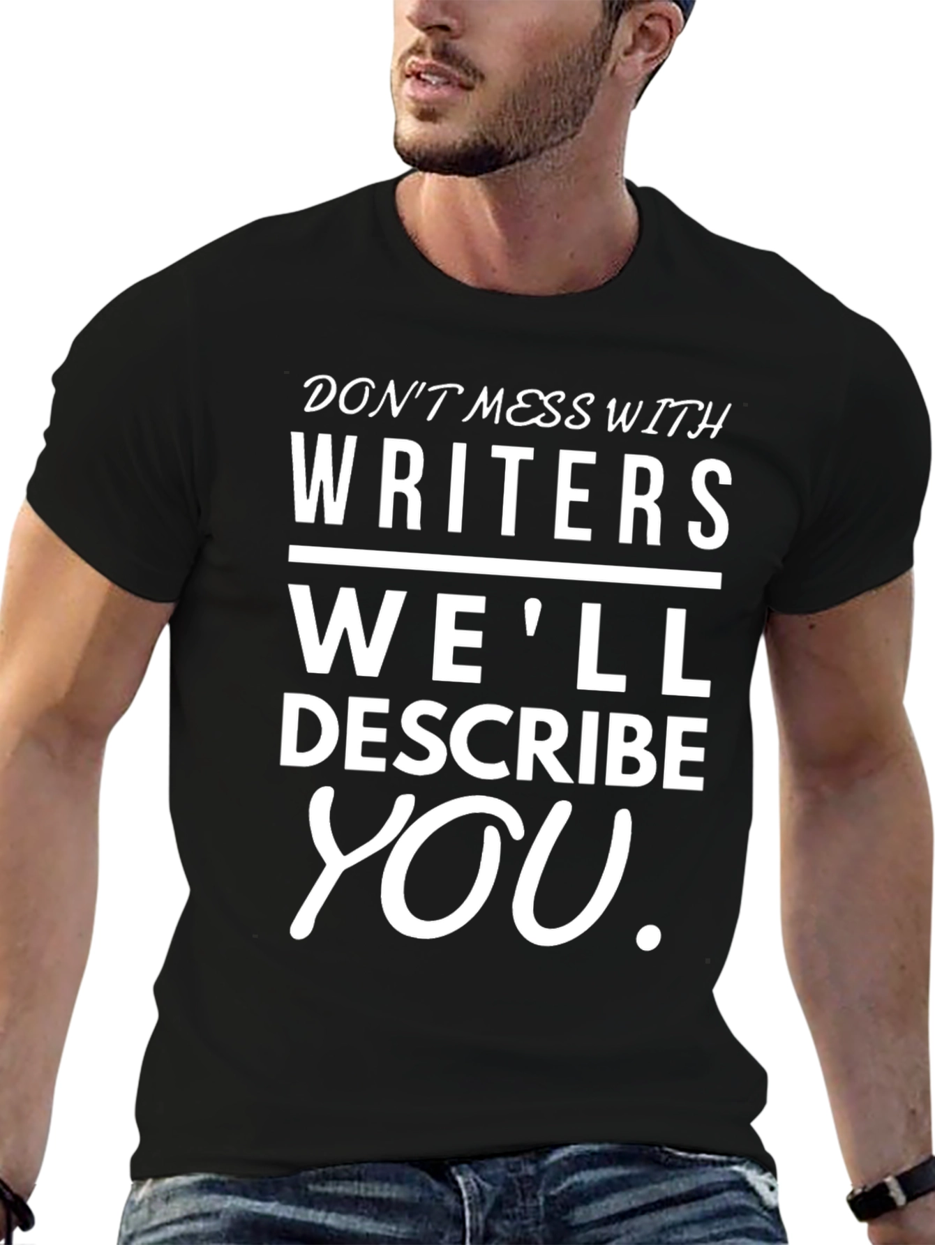 Declare your passion for writing with this eye-catching black t-shirt. The shirt features a bold white text design that reads "DON'T MESS WITH WRITERS WE'LL DESCRIBE YOU." Made from comfortable materials, this t-shirt is perfect for casual wear, writing groups, or literary events. Show off your unique sense of humor and literary prowess. Makes a great gift for the writer in your life or as a fun addition to your own wardrobe.