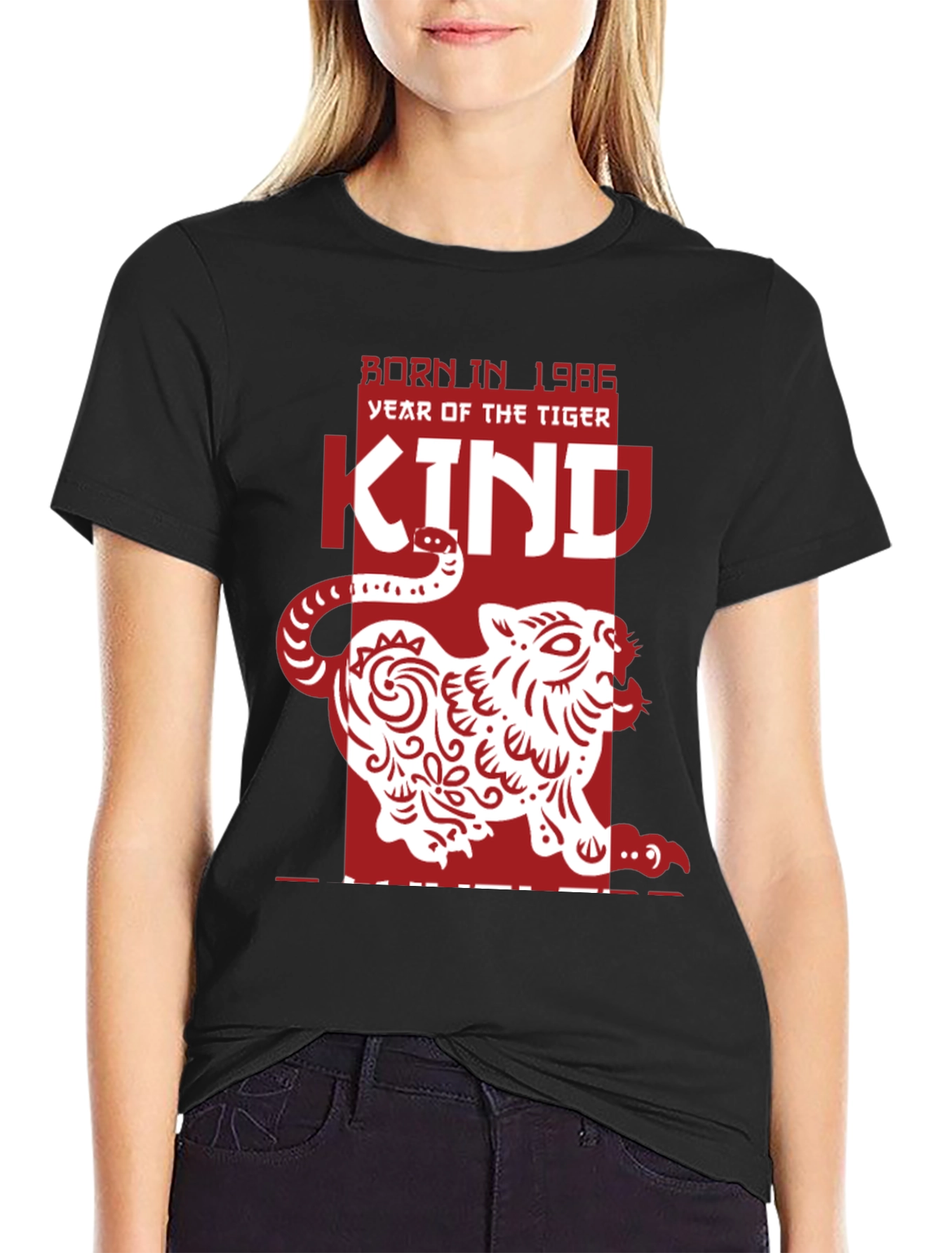 Celebrate the Year of the Tiger with this unique graphic tee. This black t-shirt features a bold red and white design incorporating a stylized tiger illustration. The words "Born in 1986" and "Year of the Tiger" are prominently displayed above the central graphic. The shirt is made from a comfortable-looking material that appears to be a cotton blend, perfect for everyday wear. Show off your unique style and commemorate your birth year with this eye-catching tee. Ideal for casual outings, parties, or as a thoughtful gift for anyone born in 1986.