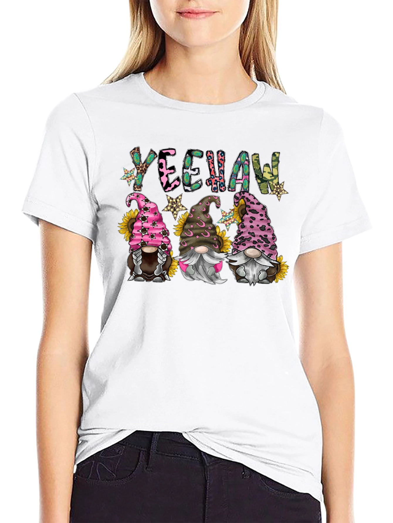 Embrace western charm with this unique black tee featuring adorable gnomes adorned with cowboy-inspired details! The tee showcases three gnomes wearing hats with playful patterns like pink stars and brown horseshoes. Each gnome holds a sunflower, adding a touch of rustic beauty to the design. The word "Yeehaw" is printed above the gnomes in vibrant, eye-catching letters, creating a fun and playful vibe. Made from a comfortable, breathable fabric, this tee is perfect for casual wear. Whether you're heading to a country concert, a casual hangout, or simply want to add a touch of whimsy to your outfit, this tee is a must-have! It will be the perfect addition to any outfit!