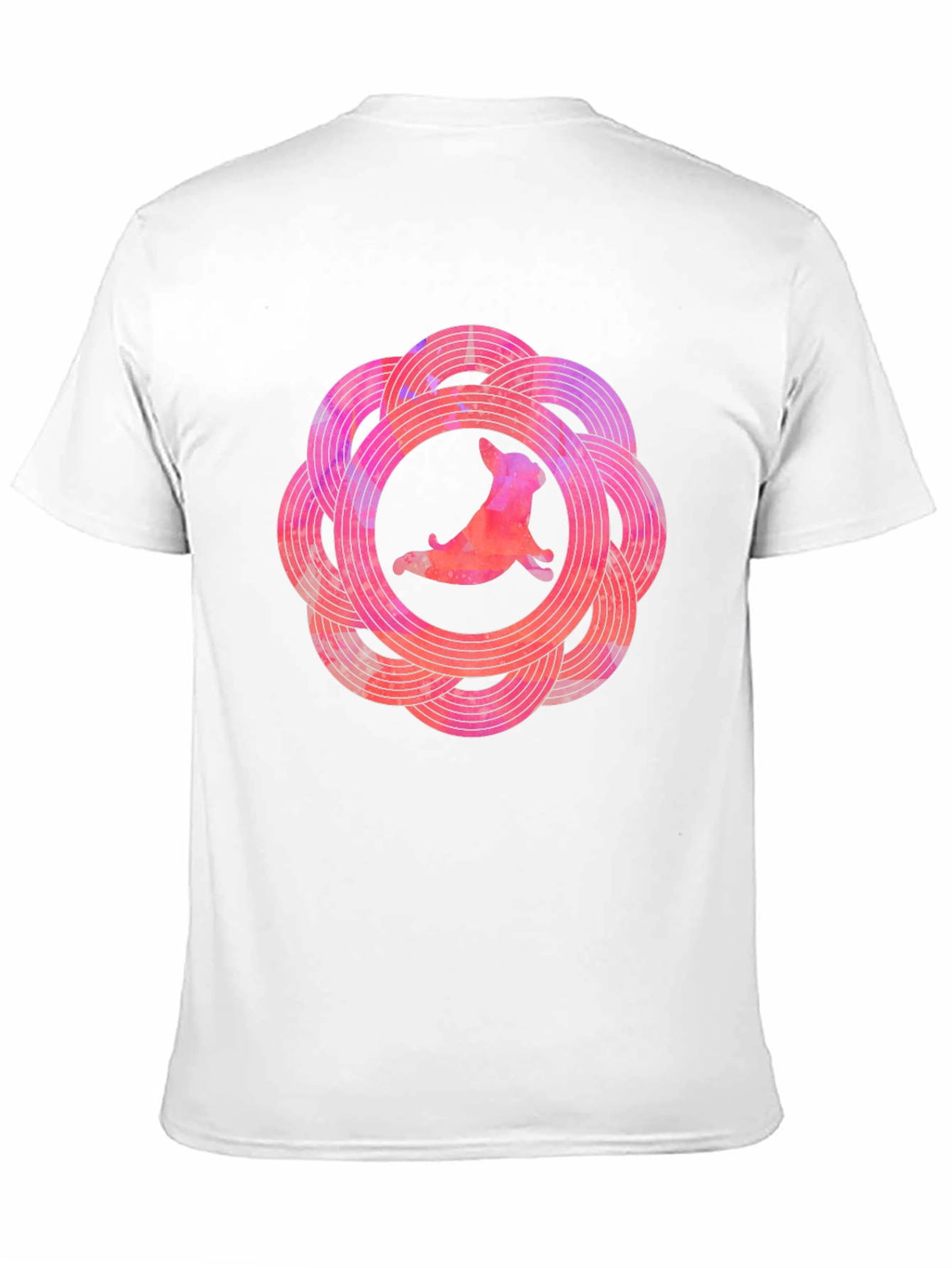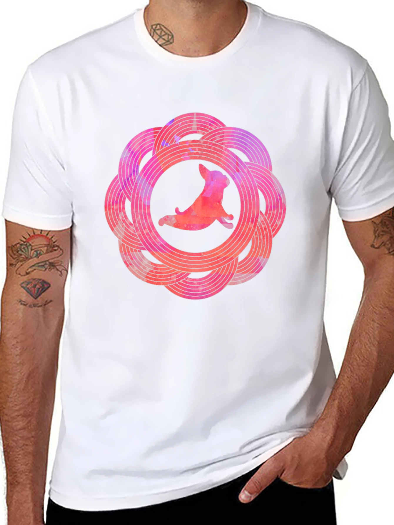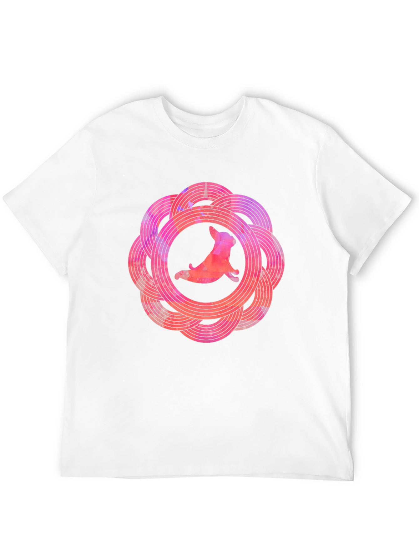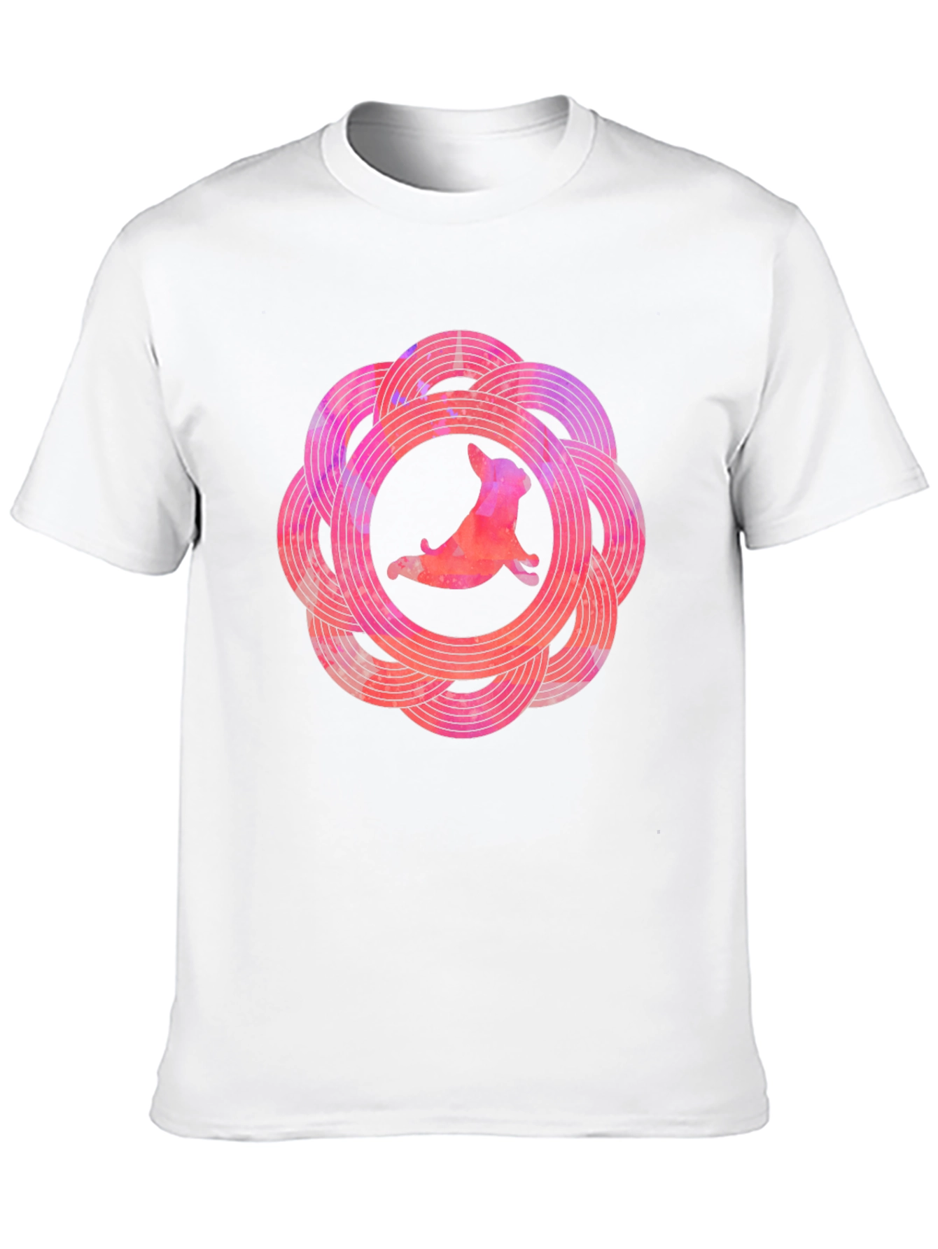 Show off your love for dogs and yoga with this unique graphic tee! The black unisex t-shirt features a striking design of a dog performing a yoga pose within a circle of interwoven shapes, all rendered in vibrant pink and orange watercolor hues. Made from a comfortable and breathable fabric, this shirt is perfect for everyday wear, yoga sessions, or casual outings. Its eye-catching design is sure to spark conversation and make a statement. Whether you're a yoga enthusiast, a dog lover, or simply appreciate unique art, this tee is a great addition to your wardrobe.