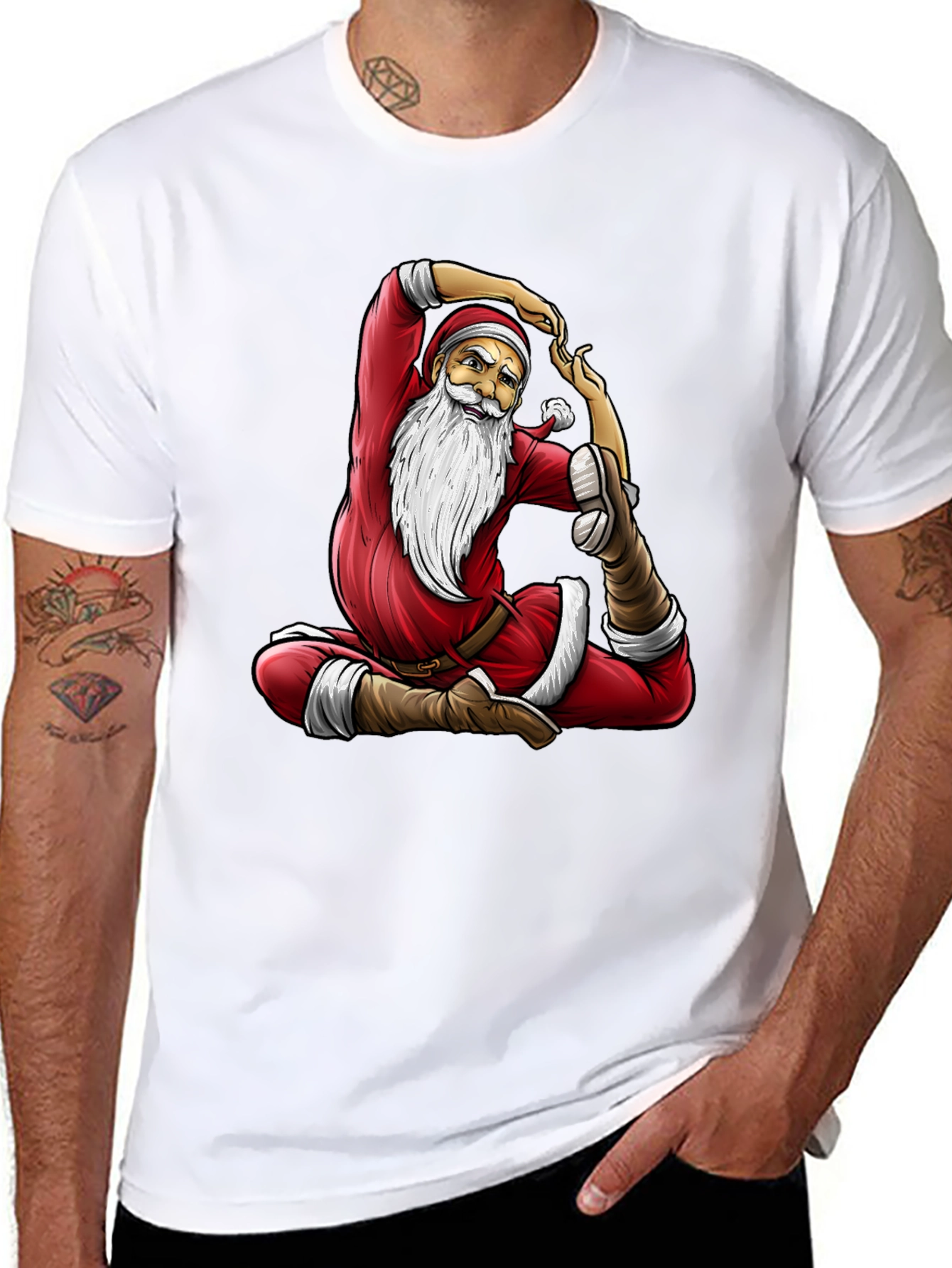 Spread holiday cheer with this unique Yoga Santa Claus T-Shirt. This eye-catching tee features a vibrant graphic of Santa Claus in a yoga pose, perfect for those who love fitness and the festive season. The T-shirt is likely made from comfortable cotton or a cotton blend, ensuring a soft and breathable fit. Its classic crew neck and short sleeves make it a versatile addition to any wardrobe. Ideal for casual wear, holiday parties, or as a fun gift for yoga enthusiasts and Santa fans alike, this t-shirt combines comfort, style, and a touch of whimsy.