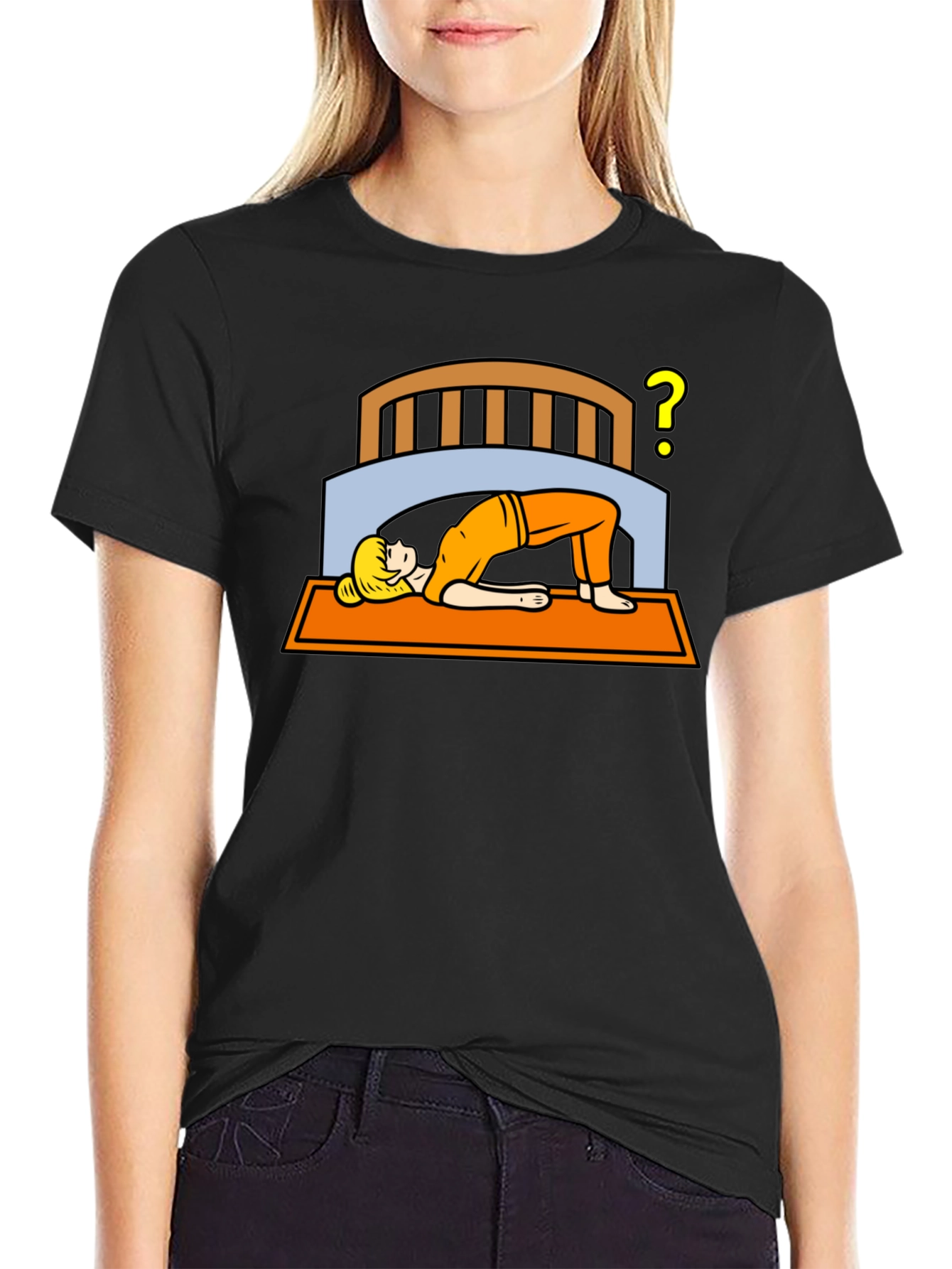 This black graphic tee features a unique and humorous cartoon design. The graphic displays a woman in a yoga pose underneath a bed frame, with a question mark floating above. Made from a comfortable-looking fabric, this t-shirt is perfect for casual wear and is sure to spark conversation. The bold graphic stands out against the black background, making it a fun addition to any wardrobe. It's ideal for yoga enthusiasts with a sense of humor or anyone who enjoys wearing quirky, eye-catching designs. Wear it to the gym, a casual outing, or simply as a comfortable everyday shirt.