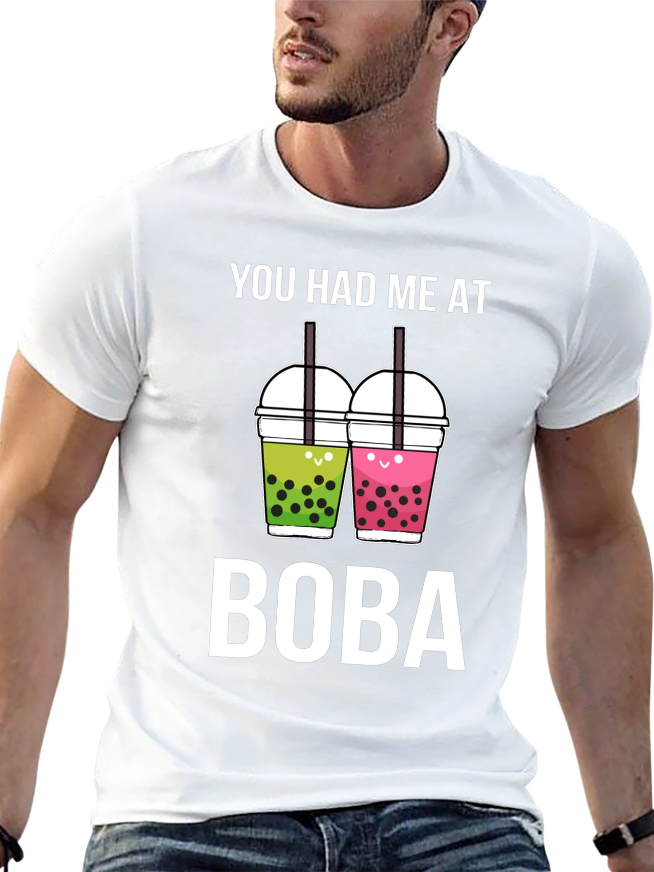 Show your boba love with this fun graphic tee. This black, short-sleeved t-shirt features a playful design with two cute boba cups and the phrase "You Had Me At Boba". Made from a comfortable fabric, it's perfect for casual outings, boba runs, or lounging at home. A great gift for boba tea enthusiasts, this unisex shirt adds a touch of whimsy to any wardrobe. Get yours today and let everyone know you're a boba addict!