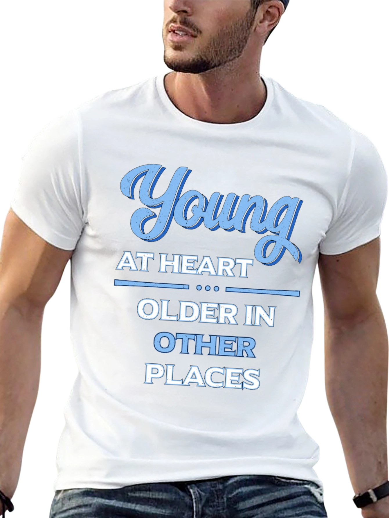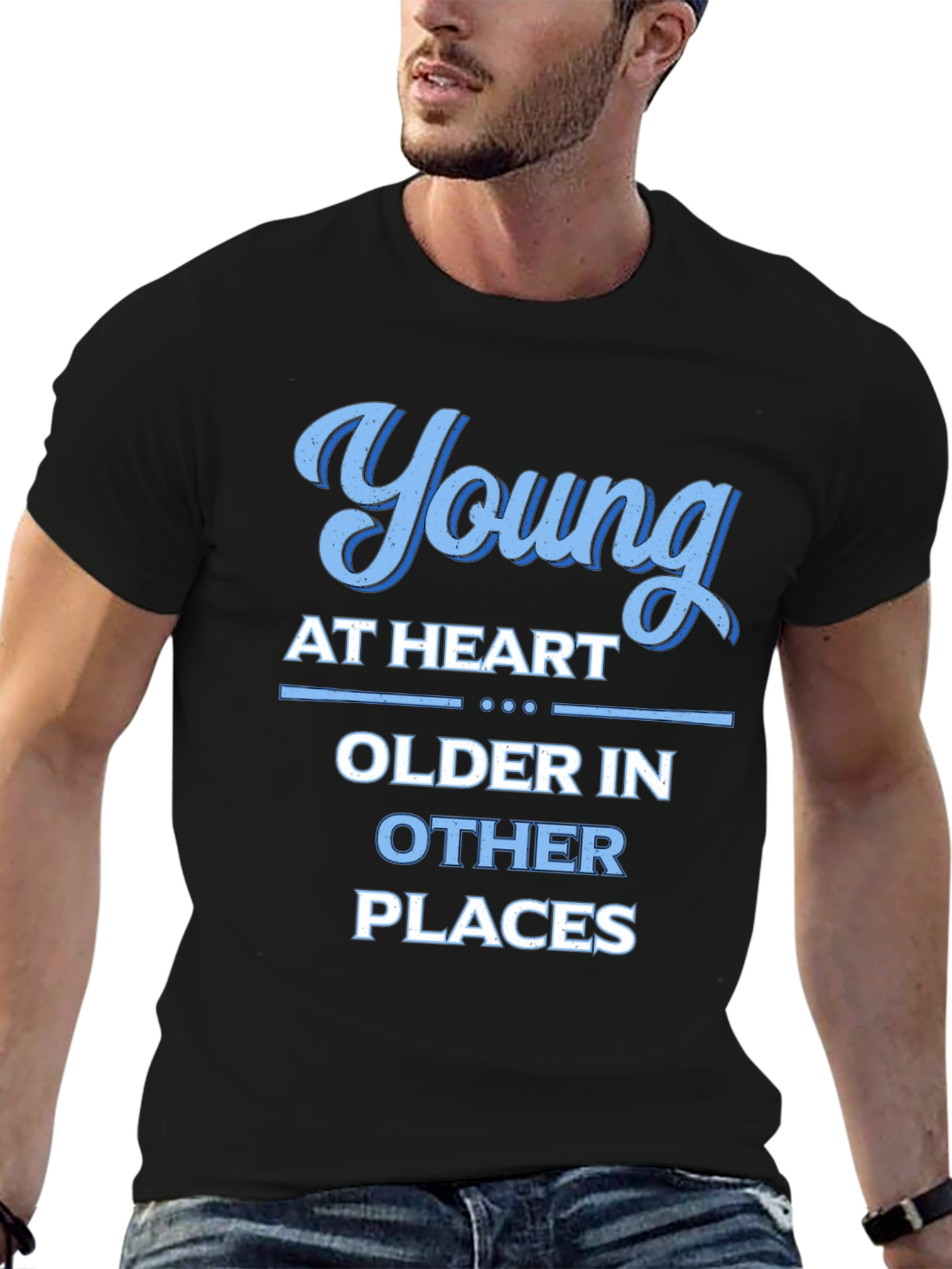 Showcase your playful spirit with this unique graphic tee! The shirt features the witty phrase "Young at Heart Older in Other Places" in a stylish, eye-catching blue font. Made from a soft, breathable fabric, this tee offers all-day comfort. The classic black background makes the message pop and ensures it pairs easily with any outfit. Perfect for casual outings, parties, or simply expressing your personality, this t-shirt is sure to spark conversations and spread smiles. Add a touch of humor to your wardrobe with this must-have piece!